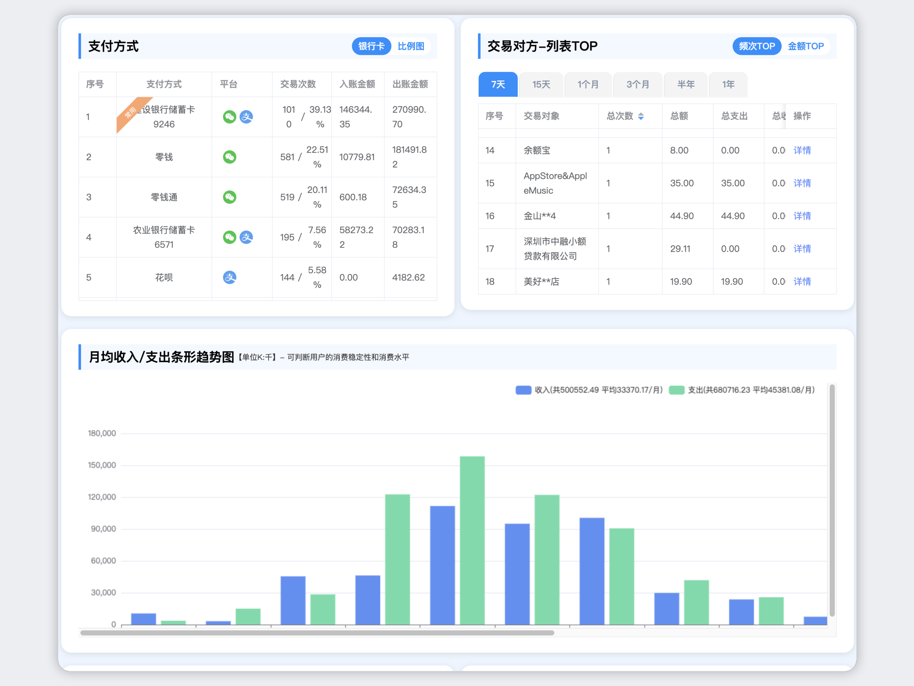 收支水平、交易标签、消费规律等多维度数据分析。